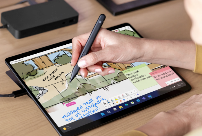 • Με τη σύνδεση μία ή δύο οθονών 4k στο Surface Pro 10 το μετατρέπετε σε μια τρίτη οθόνη με λειτουργία αφής και ψηφιακής πένας δίνοντας μια ακόμη δυνατότητα αλληλεπίδρασης στην ιδανική γωνία.