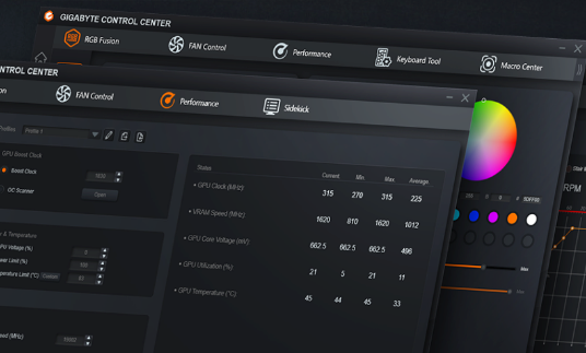 Η οθόνη LCD δεν εμφανίζει μόνο πληροφορίες για την κάρτα γραφικών, αλλά και διάφορα αγαπημένα κείμενα, φωτογραφίες και GIF. Μπορείτε επίσης να προσαρμόσετε τα εφέ φωτισμού μέσω του GIGABYTE CONTROL CENTER.