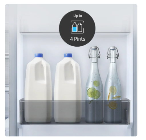 Μεγάλα μπουκάλια, κουτιά χυμών και ό,τι άλλο θες για να ξεδιψάς; Το μεγάλο ράφι στην πόρτα τα χωράει όλα, οργανωμένα και άμεσα προσβάσιμα. Γιατί ποιος θέλει να ψάχνει το νερό πίσω από τα τάπερ;