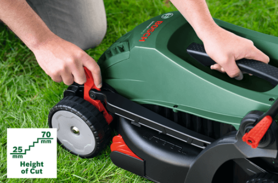 Η λαβή διαθέτει έναν ενσωματωμένο μοχλό 5 βαθμίδων, για εύκολες και προσβάσιμες αλλαγές στο ύψος κοπής με ένα ρυθμιζόμενο εύρος 25-70 mm.