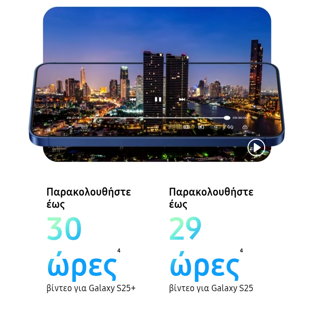 Η τεχνολογία mDNIe είναι ενσωματωμένη στο προσαρμοσμένο AP και με τη βελτιστοποίηση λογισμικού, ο χρόνος χρήσης της μπαταρίας Galaxy S25 έχει βελτιωθεί για να μπορείτε να απολαμβάνετε ώρες παρακολούθησης βίντεο.