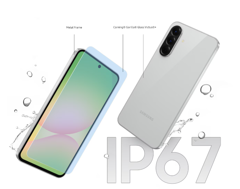 Ο συμπαγής μεταλλικός σκελετός και το Corning Gorilla Glass Victus+ διατηρούν την εντυπωσιακή σχεδίαση του Galaxy A56 5G. Και με προστασία IP67, η νέα σειρά Galaxy A είναι ανθεκτική στη σκόνη και στο γλυκό νερό (έως και 1m και για 30').