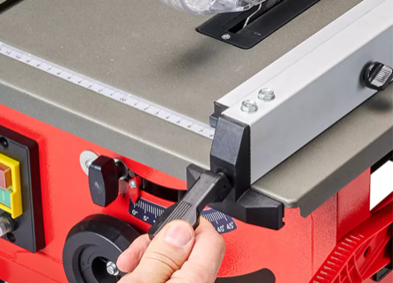 Η λεπίδα μπορεί να έχει κλίση έως 45°, η οποία σε συνδυασμό με το στοπ γωνίας (+/- 45°) καθιστά δυνατές τις ακριβείς κοπές σε φαλτσογωνιά. Για μέγιστη ασφάλεια κατά το πριόνισμα, μπορεί επίσης να ρυθμιστεί η κατακόρυφη θέση της λεπίδας του πριονιού. Το επιτραπέζιο πριόνι είναι εξοπλισμένο με ένα σχισμοειδή φράκτη με σφιγκτήρες και στις δύο πλευρές.
