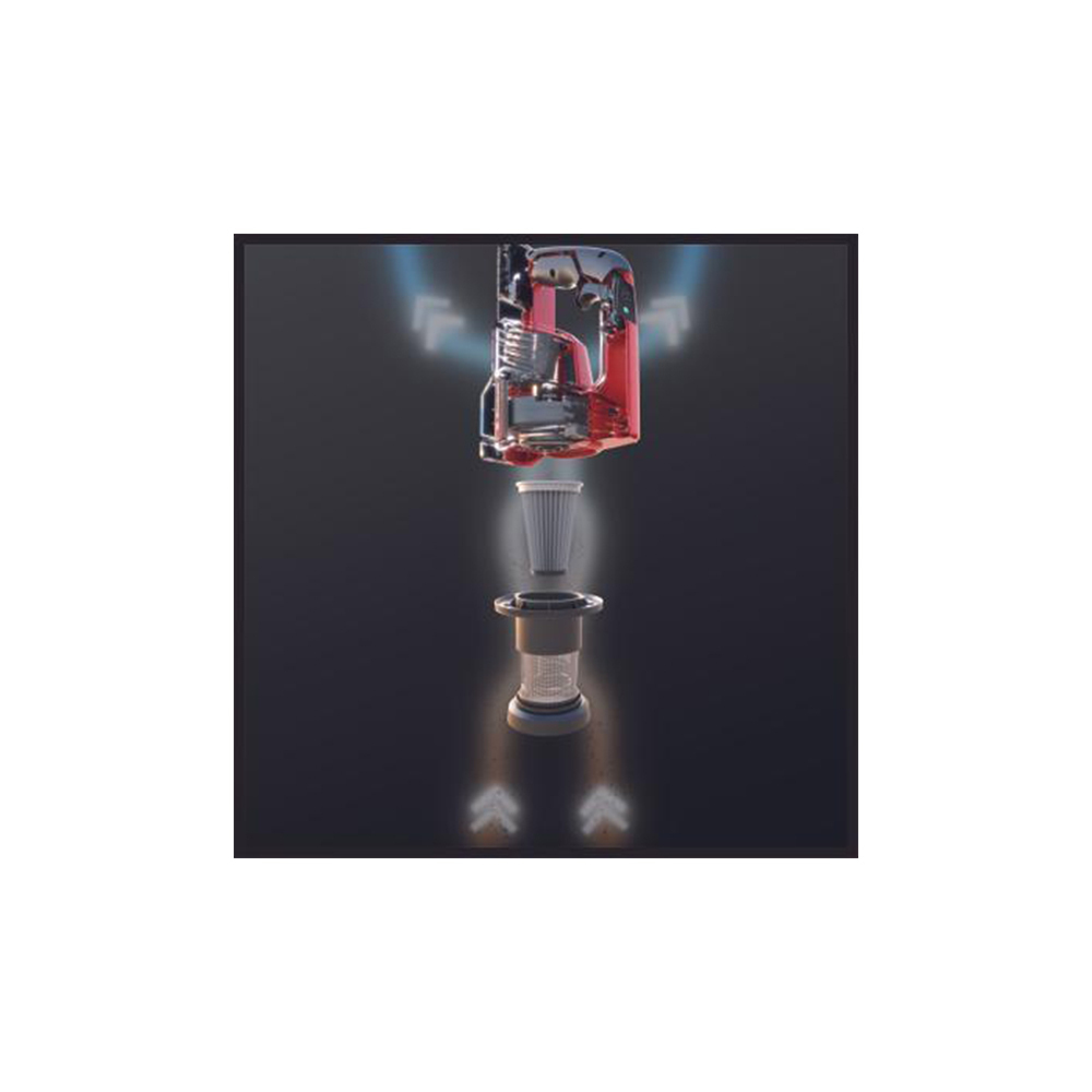 Η σκούπα διαθέτει ένα προηγμένο σύστημα φίλτρων 3 σταδίων, που περιλαμβάνει τεχνολογία κυκλώνα με προφίλτρο, πλενόμενο πτυχωτό φίλτρο και φίλτρο κινητήρα — για αέρα εξαγωγής χωρίς σκόνη και ισχυρή αναρρόφηση.